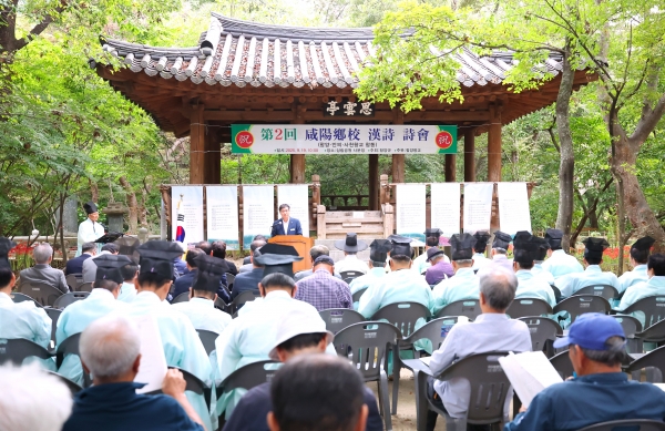 진병영 함양군수는 축사를 통해 “오늘 여러분께서 읊으시는 한 수 한 수가 서로의 가슴에 울려 퍼지며 함양의 문화적 자긍심을 더욱 높여줄 것이라 믿는다”며 “우리 선조들이 한시를 벗으로 삼아 도를 실천하고 풍류를 즐겼듯이, 맑은 물과 푸른 숲, 고즈넉한 정자가 어우러진 이 자리에서 옛 선현의 기품을 잇는 시향이 가득 피어나리라 기대한다”고 말했다.