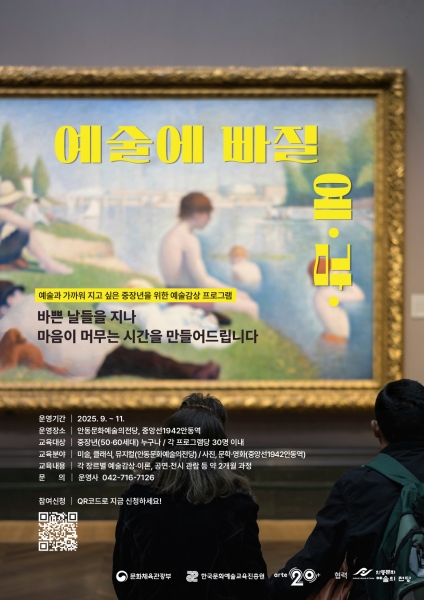 [한국Q뉴스] 중장년층의 건강한 여가 생활과 문화 향유 기회 확대를 위해 안동문화예술의전당이 오는 9월 22일부터 중장년 여가 예술감상교육 프로그램 ‘2025 예술에 빠질 예.감.’을 진행한다.