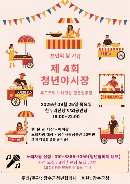 [한국Q뉴스] 장수군은 오는 25일 오후 6시부터 장수한누리전당 야외공연장에서 ‘제4회 청년의 날 기념 장수 청년 야시장’을 개최한다고 밝혔다.