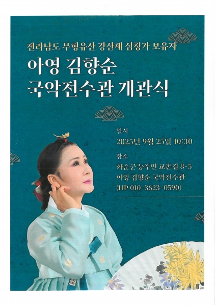 김향순 명창은 평소 우리 국악의 보존 전승을 위해 ‘아영 김향순 국악전수관을 꿈꿔왔으며 이를 위해 2024년부터 능주면 남정리에 목조구조 114㎡ 규모인 국악전수관 건축공사를 몸소 추진해 이번에 완공했다.