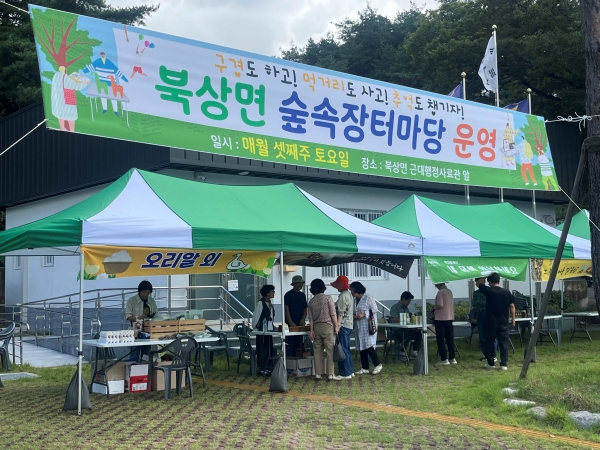 ‘숲속장터마당’은 북상면 주민자치회 주관하는 주민주도형 행사로 북상면 농산물의 우수성과 마을의 따뜻한 정취를 방문객에게 전달하고 주민들에게는 소득 창출과 공동체 의식 강화에 기여하고 있다.