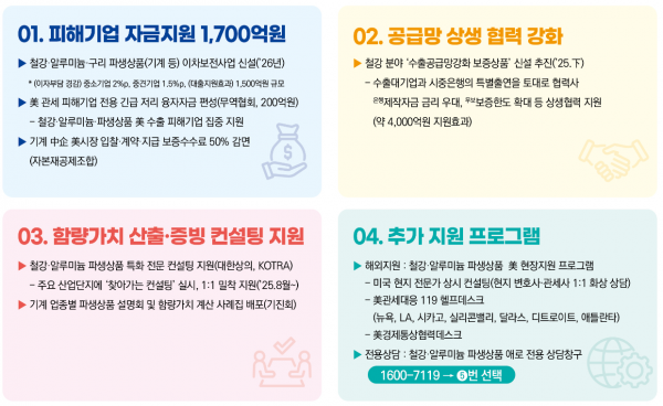 미 정부에 대한 수출기업 관세 애로 의견서 제출 지원, ‘美 관세청 사전심사제도’ 신청 컨설팅, CBP 사후 검증 요구자료 대응 지원 서비스 등을 9월 중 신속히 개시하고 철강 파생상품 기업 특화 지원프로그램도 추가로 도입할 예정이다.
