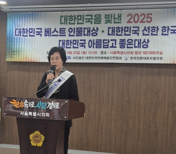 [한국Q뉴스] 경기도의회 건설교통위원회 박명숙 의원이 22일 서울시의회 별관 2층에서 열린 ‘2025 대한민국 베스트 인물대상’에서 광역의정대상에 선정되는 영예를 안았다.