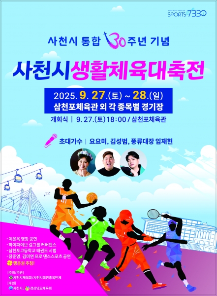 [한국Q뉴스] 사천시는 시 통합 30주년을 기념해 오는 9월 27일부터 28일까지 이틀간 삼천포체육관 및 시 전역의 종목별 경기장에서 ‘사천시생활체육대축전’을 개최한다고 23일 밝혔다.