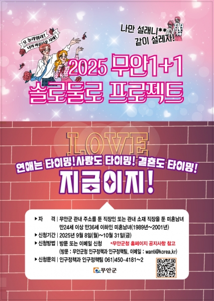 [한국Q뉴스] 전남 무안군이 올가을, 솔로 청춘들의 마음을 흔드는 핫 이벤트, 이름해 ‘2025 무안 1+1 솔로둘로 프로젝트’를 다시 개최한다.