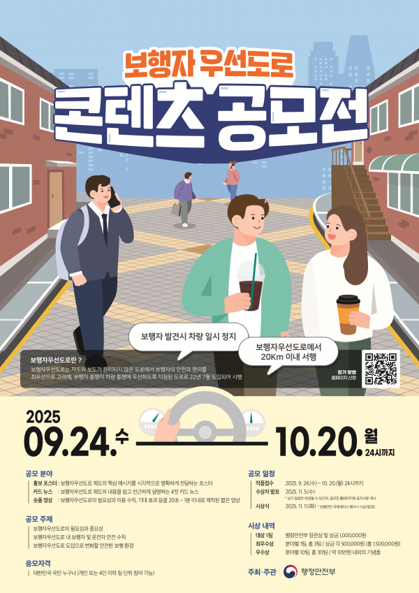 [한국Q뉴스] 행정안전부는 보행자우선도로에 대한 국민적 관심과 이해를 높이기 위해 9월 24일부터 10월 20일까지 ‘보행자우선도로 홍보 콘텐츠 대국민 공모전’을 개최한다.