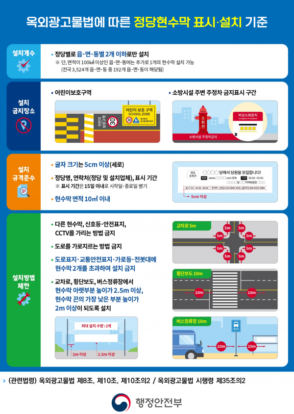 다만, 어린이보호구역과 소방시설 주변은 설치가 금지되며 특히 보행자나 차량 운전자 시야를 가릴 우려가 있는 교차로 횡단보도 주변은 현수막 아랫부분 기준 높이 2.5m 이상으로 설치해야 한다.