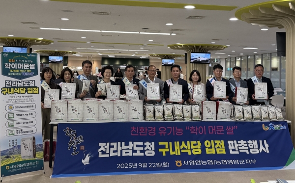 영암군과 서영암농협이 22일 전남도청에서 저탄소 유기농 학이머문쌀 시식 및 나눔행사를 열고 매월 1톤씩을 구내식당에 공급하기로 했다.