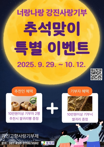 강진원 강진군수는 “여름 행사의 성원에 힘입어 한가위 맞이 고향사랑기부 이벤트를 준비했다”며 “세액공제와 답례품 기본 혜택에 더해 강진 쌀귀리를 받아보시길 바란다”고 말했다.