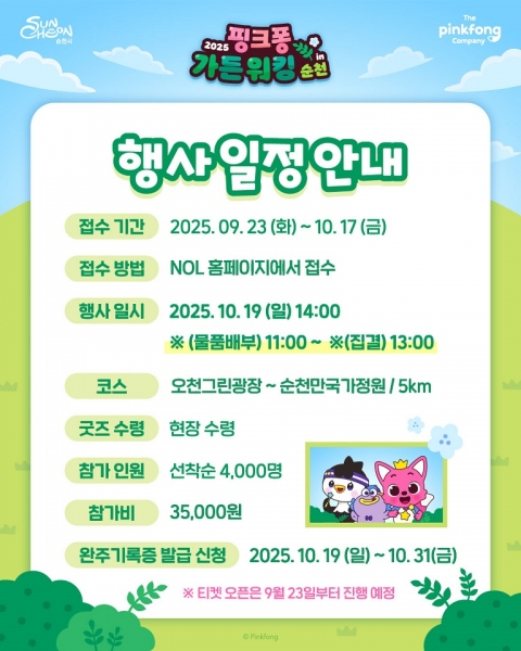 한편 핑크퐁 가든 워킹은 글로벌 콘텐츠 페스티벌 in 순천, 올텐가와 연계해 개최된다.