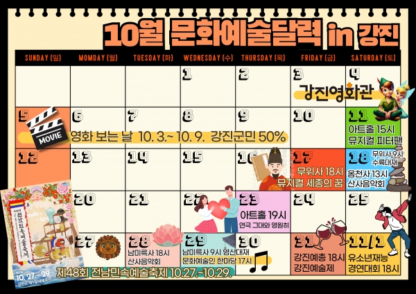 [한국Q뉴스] 강진군은 선선한 가을바람과 함께 군민의 문화적 감수성을 채워줄 다채로운 문화예술 행사를 10월 집중 운영한다고 29일 밝혔다.