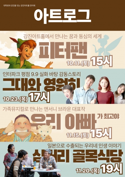 오는 10월 11일 ‘피터팬’을 시작으로 이어지는 ‘아트로그 가을 시즌’ 관람 신청은 강진군청 누리집 가입-소통과 참여-공연/행사 게시판에서 댓글로 참여할 수 있다.