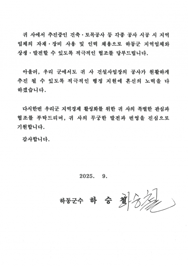 하승철 하동군수는 서한문을 통해 “지역 건설의 지속적인 발전 유지를 위해 하도급 계약을 중심으로 근로자, 건설장비·자재 등 지역업체를 우선 사용해 달라”고 요청했다.