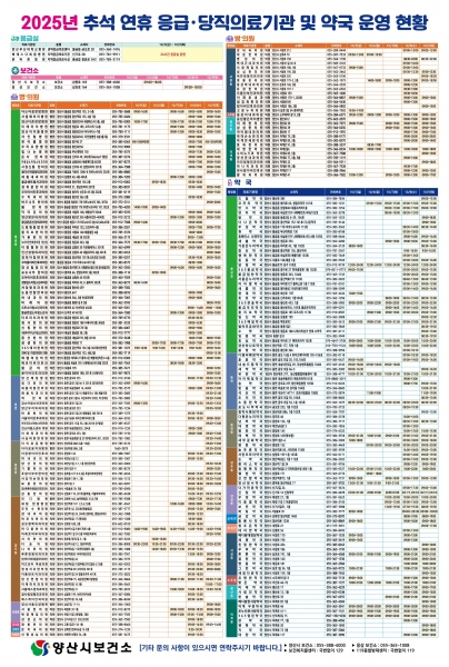 연휴 동안 진료 가능한 의료기관과 약국 정보는 응급의료포털, 양산시청·보건소 홈페이지 또는 응급똑똑 앱에서 확인할 수 있다.