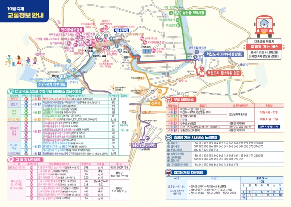 진주시 관계자는“관외 관람객은 고속도로나 국도 진입로 근처 임시주차장에 주차 후, 무료 셔틀버스를 이용하고 진주시민은 올해 새롭게 시행된 청소년 100원 요금제 및 경남패스 등으로 혜택이 확대된 시내버스를 이용함으로써, 다함께 편안하고 안전한 축제를 즐길 수 있도록 관람객들께서 적극 협조해 주실 것”을 당부하며“축제장 주변 교통환경을 안전하고 쾌적하게 조성해 관람객 이동에 불편함이 없도록 최선을 다하겠다”고 밝혔다.