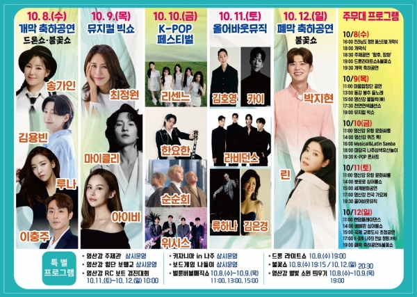 무엇보다도 송가인, 최정원, 마이클 리, 아이비, 김호영, 카이, 린, 박지현 등 국내 최정상급 아티스트와 K-POP 스타들이 총출동해 ‘레전드 라인업’ 으로 손꼽히는 이번 영산강축제는 그 어느 해보다 큰 관심을 끌고 있다.