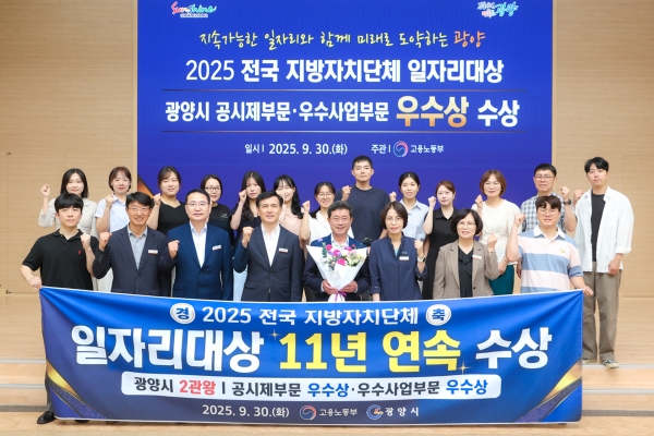[한국Q뉴스] 광양시는 9월 30일 청주 오스코에서 열린 고용노동부 주관 ‘2025년 전국 지방자치단체 일자리대상’ 시상식에서 공시제 부문과 우수사업 부문 모두 우수상을 수상하며 2015년부터 11년 연속 수상이라는 값진 성과를 거뒀다고 밝혔다.