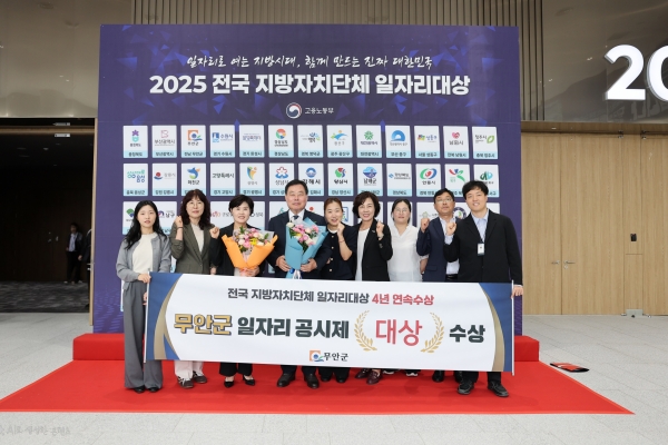 [한국Q뉴스] 전남 무안군은 30일 청주 오스코에서 열린 ‘2025년 전국 지방자치단체 일자리대상’에서 일자리 공시제 부문 대상을 수상하며 국무총리 기관표창과 함께 인센티브 사업비 8,500만원을 확보했다.