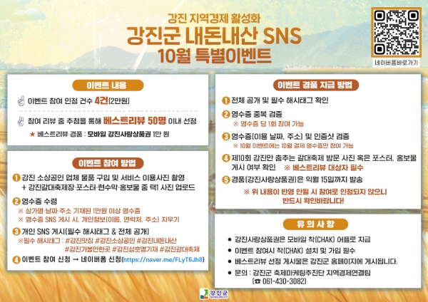 [한국Q뉴스] 강진군이 제10회 강진만춤추는 갈대축제를 기념해 관내 소상공인 업소 활성화와 홍보 지원을 위해 추진 중인 ‘강진군 내돈내산 SNS 리뷰 이벤트’를 10월 한 달간 특별하게 진행한다.