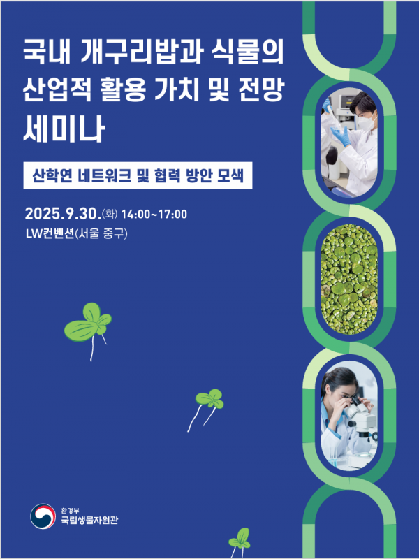 [한국Q뉴스] 환경부 소속 국립생물자원관은 9월 30일 오후 엘더블유컨벤션에서 ‘개구리밥과 식물의 산업적 활용 가치 및 전망’을 주제로 토론회를 개최한다고 밝혔다.