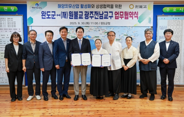 [한국Q뉴스] 완도군이 완도 해양치유산업 활성화를 위해 원불교 광주전남교구와 업무 협약을 체결했다.