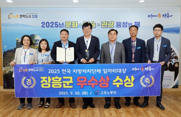 [한국Q뉴스] 장흥군이 지난 30일 충북 청주 오스코에서 열린 고용노동부 주관 ‘2025 전국지방자치단체 일자리대상’에서 공시제 분야 우수상을 수상했다.