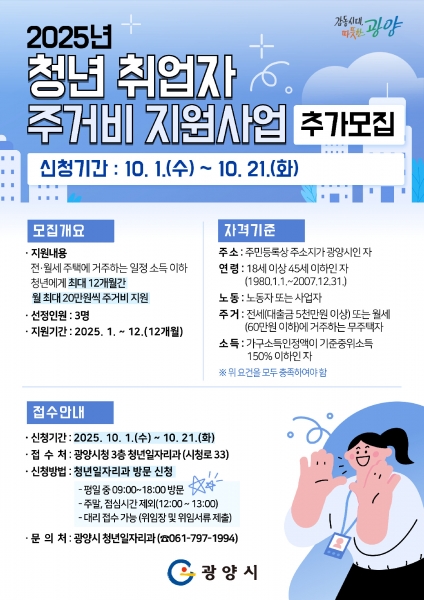 [한국Q뉴스] 광양시는 청년들의 주거 안정을 위해 10월 1일부터 21일까지 ‘2025년 청년 취업자 주거비 지원사업’ 추가 모집을 진행한다고 밝혔다.