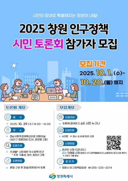 [한국Q뉴스] 창원특례시는 ‘시민이 제안한 인구정책을 시민이 직접 사업화 및 고도화 시킨다’는 취지로 오는 10월 29일 ‘2025 창원 인구정책 시민토론회’를 개최하고 이를 위해 10월 1일부터 20일까지 시민 토론참가자를 모집한다고 밝혔다.