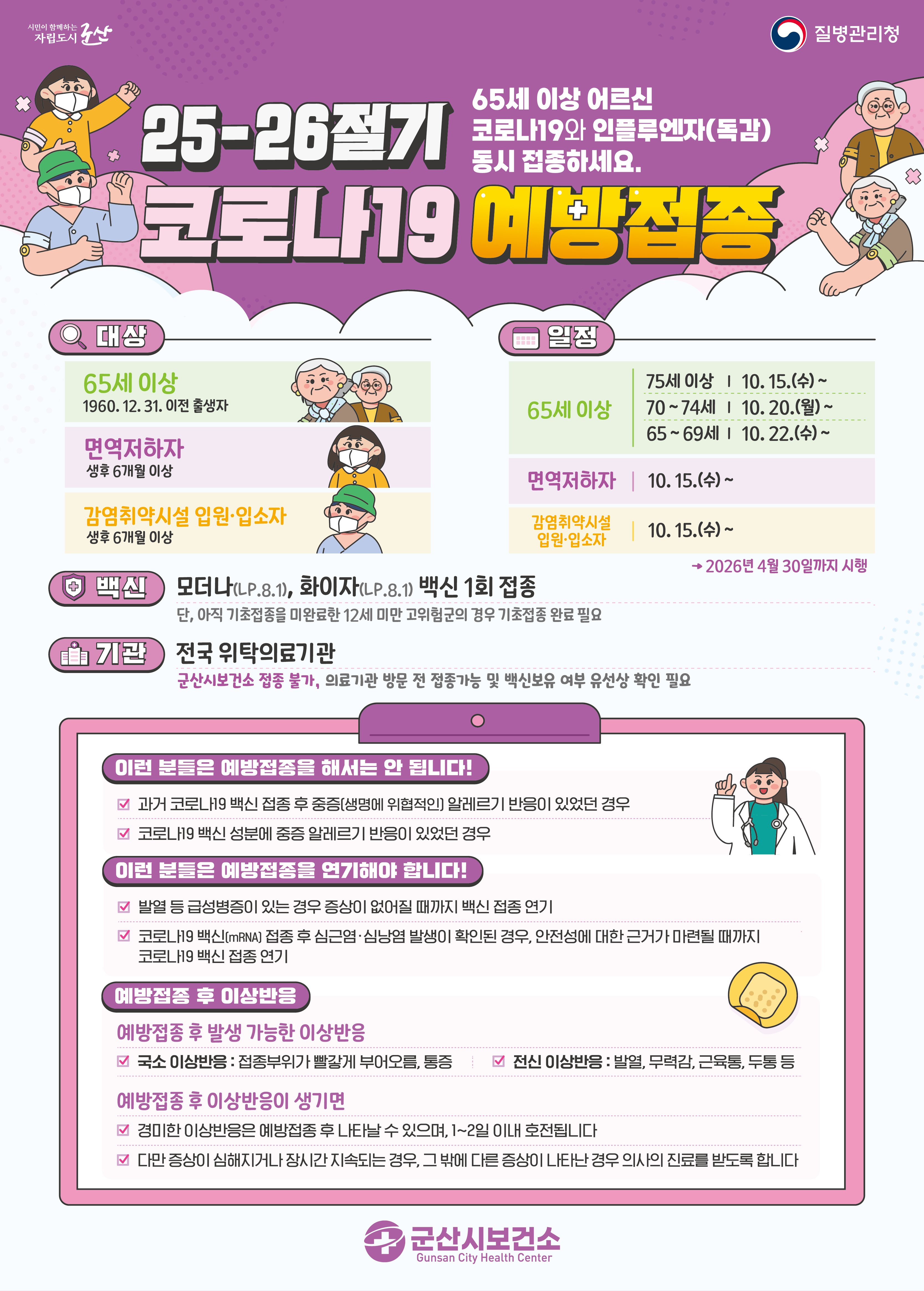 [한국Q뉴스] 군산시는 올겨울 독감과 코로나19 동시 유행에 대비하여 10월 15일부터 내년 4월 30일까지 인플루엔자와 코로나19 예방접종을 실시한다. 접종은 10월 15일 75세 이상을 시작으로 연령대별로 순차적으로 진행되며, 특히 65세 이상은 두 백신을 같은 날 동시 접종할 것이 권고된다. 또한 19~59세 취약계층, 14~18세 및 60~64세 군산시민 등은 10월 27일부터 인플루엔자 무료접종을 받을 수 있다. 접종 전 지정의료기관의 백신 보유 현황을 반드시 확인해야 한다.