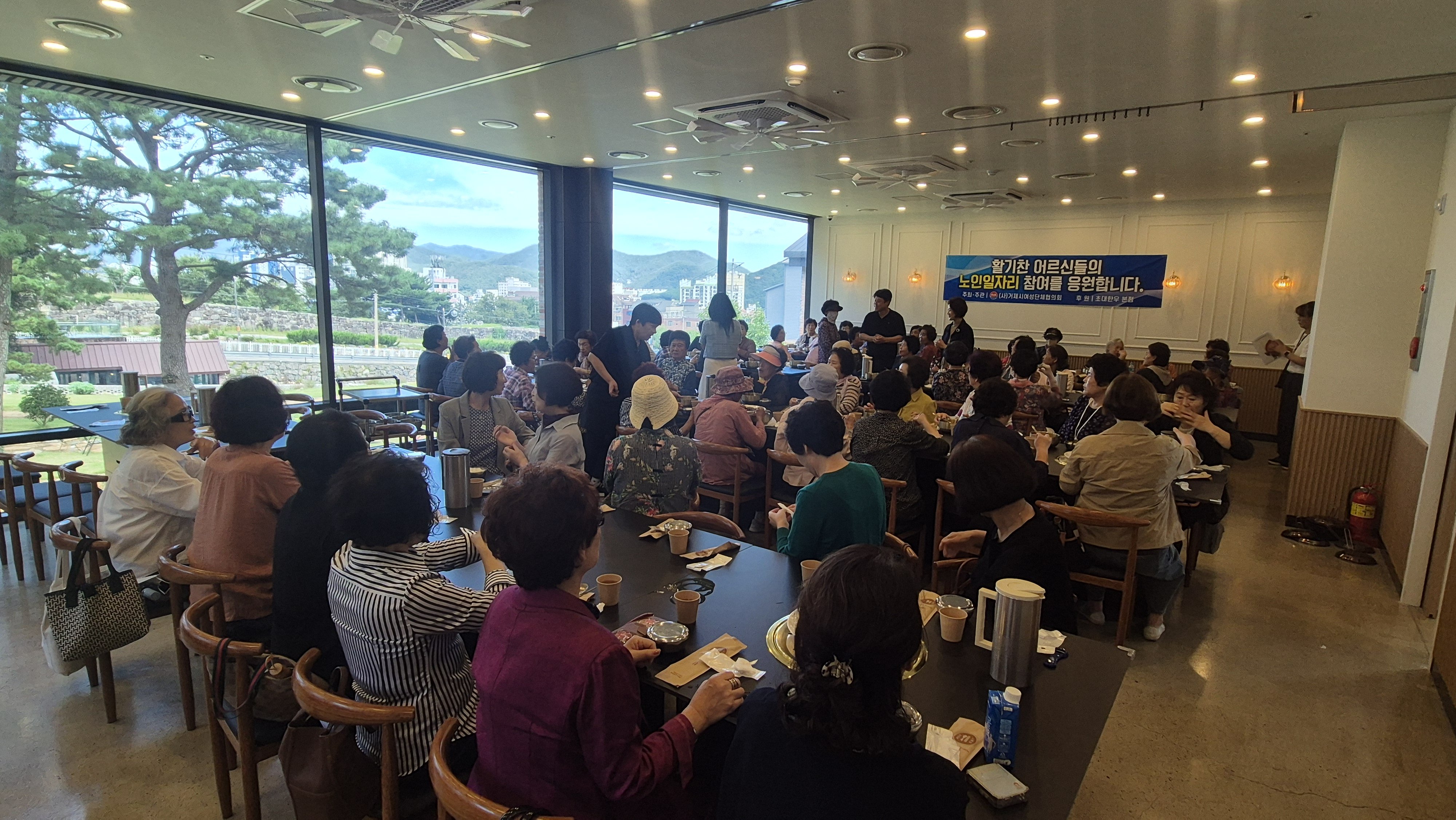 [한국Q뉴스] 거제시 여성인력개발센터(센터장 박재자)는 지난 무더운 여름 동안 노인사회활동지원사업에 참여한 어르신들을 격려하기 위해 지역 음식점 ‘초대한우 본점’과 함께 점심식사 나눔 행사를 마련했다. 이번 행사는 초대한우 본점 대표의 뜻있는 제안으로 성사됐다.