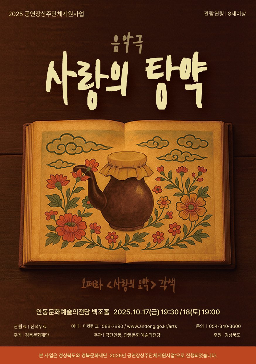 창작 음악극 ‘사랑의 탕약’은 10월 17일(금) 오후 7시 30분과 18일(토) 오후 7시, 양일에 걸쳐 안동문화예술의전당 백조홀 무대에서 열린다.