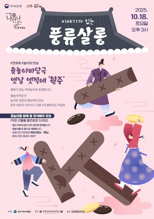 원주전통문화교육원 관계자는 “가을과 함께 무르익어가는 원주향교에 놀러 오셔서 원주 천년의 이야기와 전통 놀이가 어우러진 신명난 마당극을 즐기시길 바란다”고 말했다.