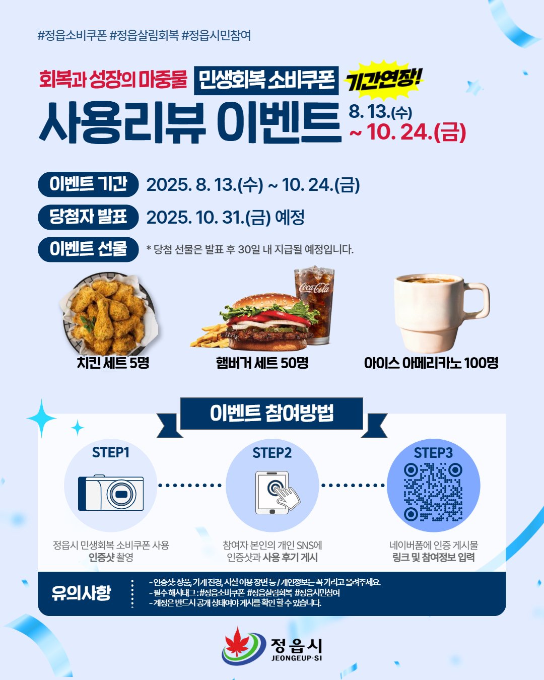 정읍시가 시민들의 높은 호응을 얻고 있는 ‘민생회복 소비쿠폰 SNS 인증 이벤트’ 기간을 오는 24일까지 연장한다.