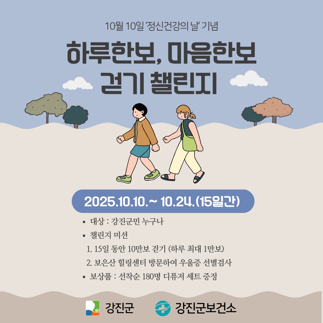 [한국Q뉴스] 강진군보건소가 지난 10일 정신건강의 날을 기념해 군민 마음 건강을 위한 ‘하루 한보, 마음 한보 걷기 챌린지’를 운영중이다.