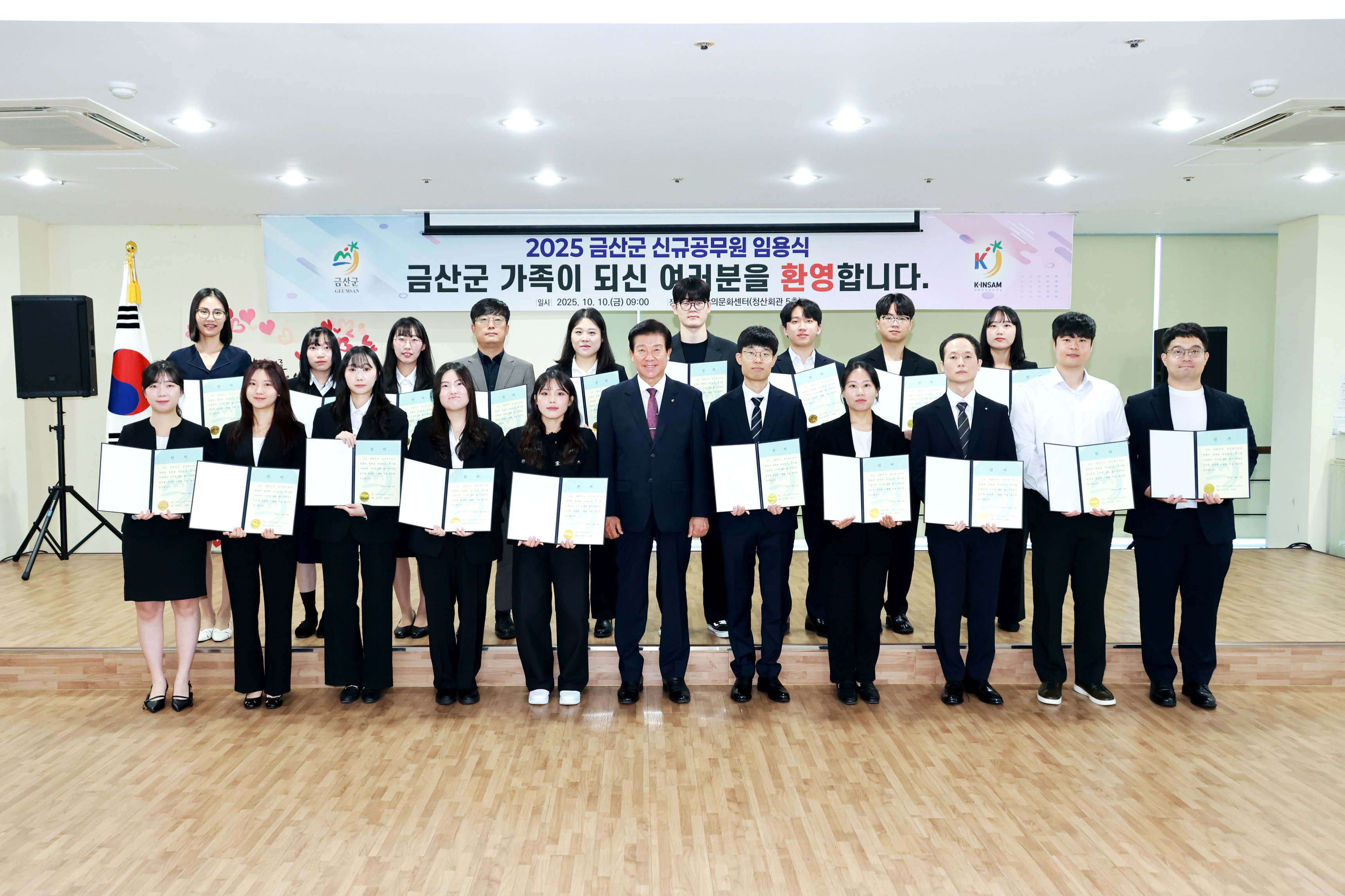 [한국Q뉴스] 금산군은 지난 10일 금산읍 청산회관에서 2025년도 신규공무원 임용장 수여식을 개최했다.