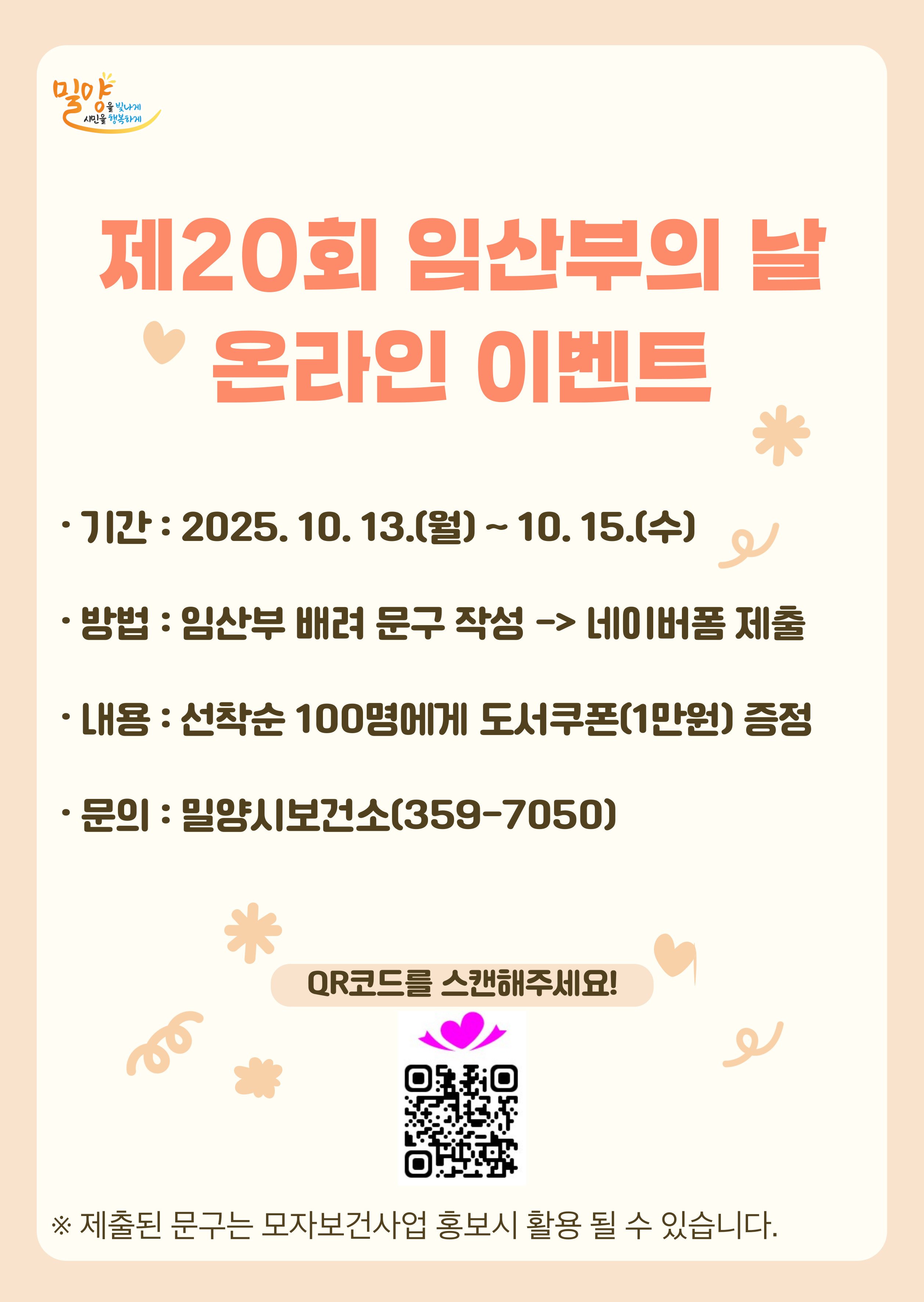 [한국Q뉴스] 경남 밀양시(시장 안병구)는 제20회 임산부의 날을 맞아 13일부터 15일까지 3일간 온라인 이벤트를 진행한다고 밝혔다.