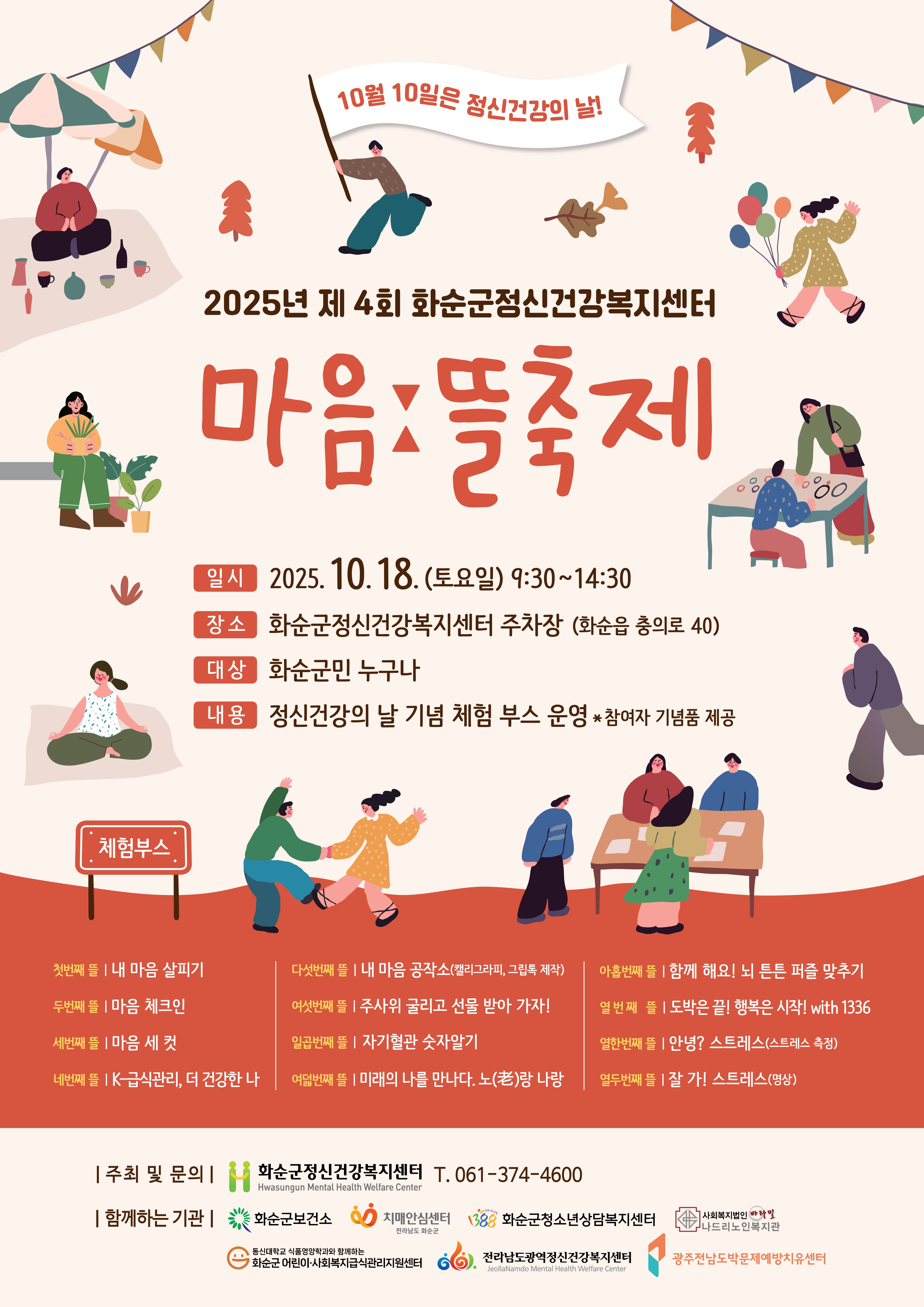 이번 축제는 화순군정신건강복지센터에서 10월 18일(토) 오전 9시 30분부터 오후 2시 30분까지 열리며 지역 주민 누구나 무료로 참여할 수 있다.