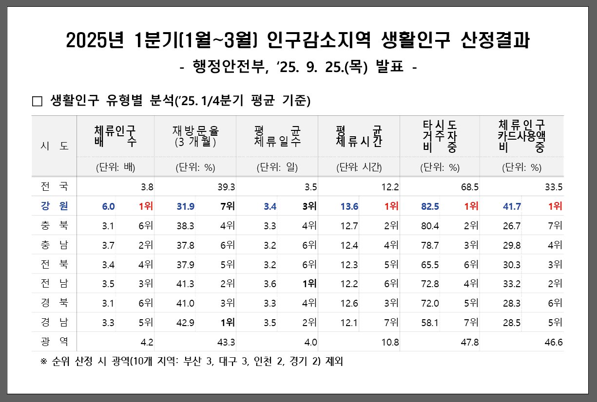 [한국Q뉴스] 강원특별자치도(도지사 김진태)는 행정안전부가 9월 25일 발표한 ‘2025년 1분기 인구감소지역 생활인구 산정 결과’에서 체류인구 총 2,826,012명으로 전국 최고 수준을 기록했다고 밝혔다.