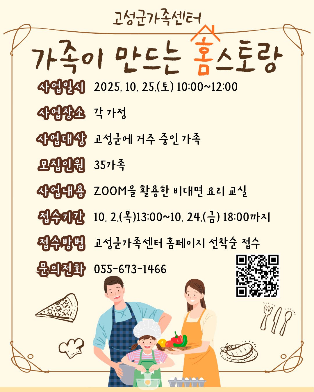 [한국Q뉴스] 고성군가족센터(센터장 황순옥)는 오는 10월 24일까지 집에서 즐기는 비대면 요리프로그램‘가족이 만드는 홈스토랑’참여 가족을 모집한다고 밝혔다.