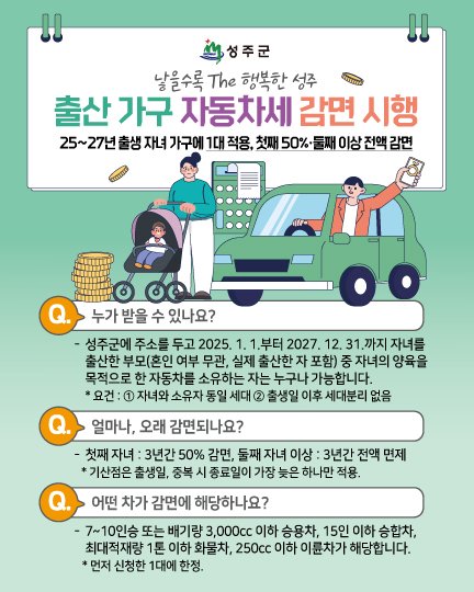 [한국Q뉴스] 성주군은 13일 올해를 포함해 2027년까지 자녀를 출산한 가구를 대상으로 자동차세를 50%(둘째 자녀 이상 전액) 감면한다고 밝혔다.