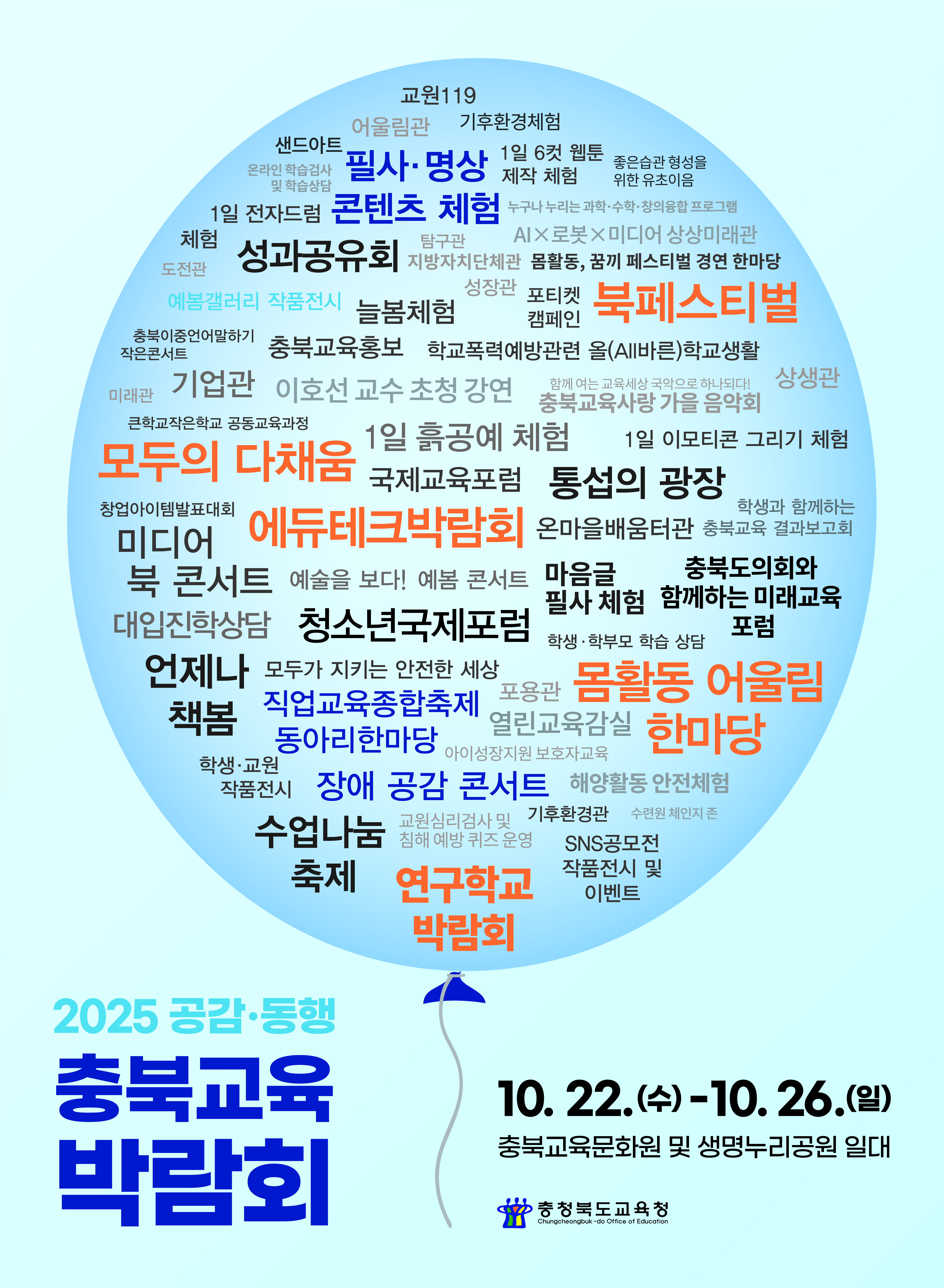 [한국Q뉴스] 충청북도교육청(교육감 윤건영)은 오는 22일(수)부터 26일(일)까지 5일간 ‘17만의 숨결, 꿈결 바람결’이라는 슬로건 아래 충북교육의 현재를 공유하고 미래 교육의 방향을 체험하는 통합형 교육박람회인 2025 공감·동행 충북교육박람회를 개최한다고 밝혔다.