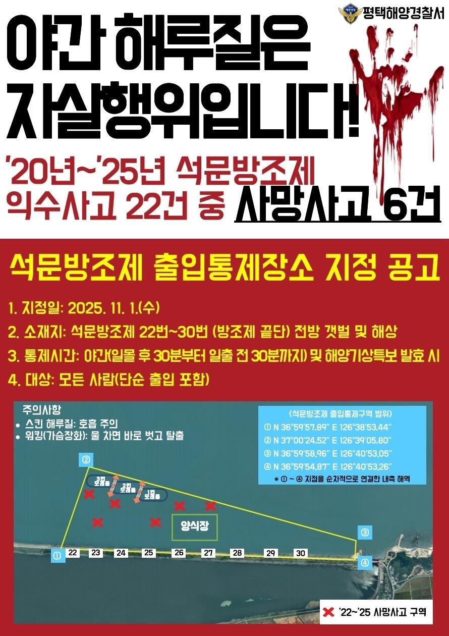 [한국Q뉴스] 당진시(시장 오성환)는 ‘연안사고 예방에 관한 법률’에 근거해 11월 1일부터 석문방조제 22번~30번 구간에 대한 야간 출입 통제를 실시한다고 14일 밝혔다.