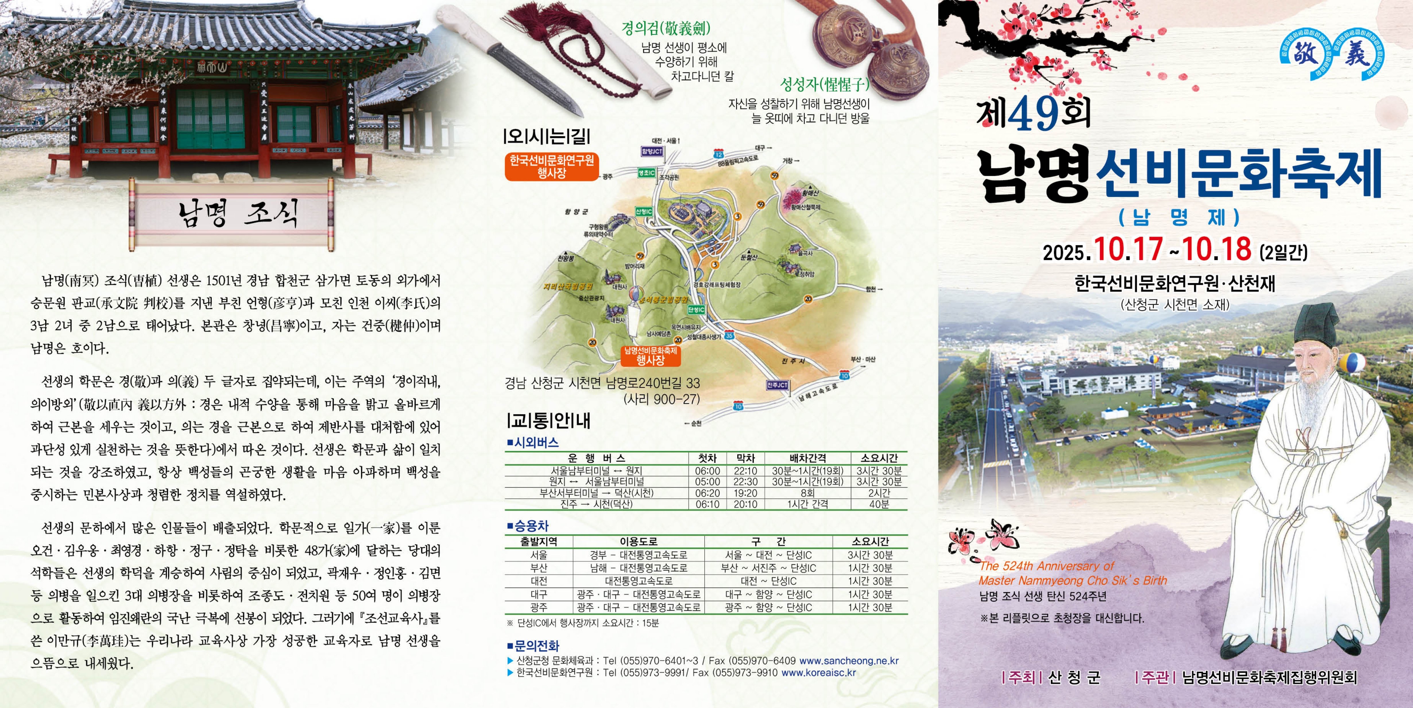 특히 청렴, 실천, 배운 사람의 자세 등 남명 조식의 ‘경의사상’을 마당극으로 풀어낸 극단 큰들의 ‘남명’ 공연으로 축제 분위기를 고조시킬 예정이다.