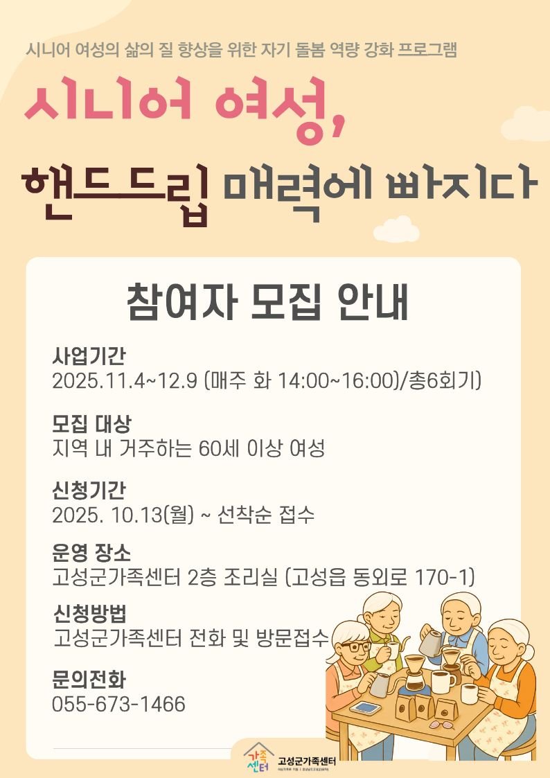 [한국Q뉴스] 고성군가족센터(센터장 황순옥)는 지역 내 60세 이상 시니어 여성의 자기 돌봄 역량 강화 프로그램 ‘시니어 여성, 핸드드립 매력에 빠지다’의 참여자를 모집한다.
