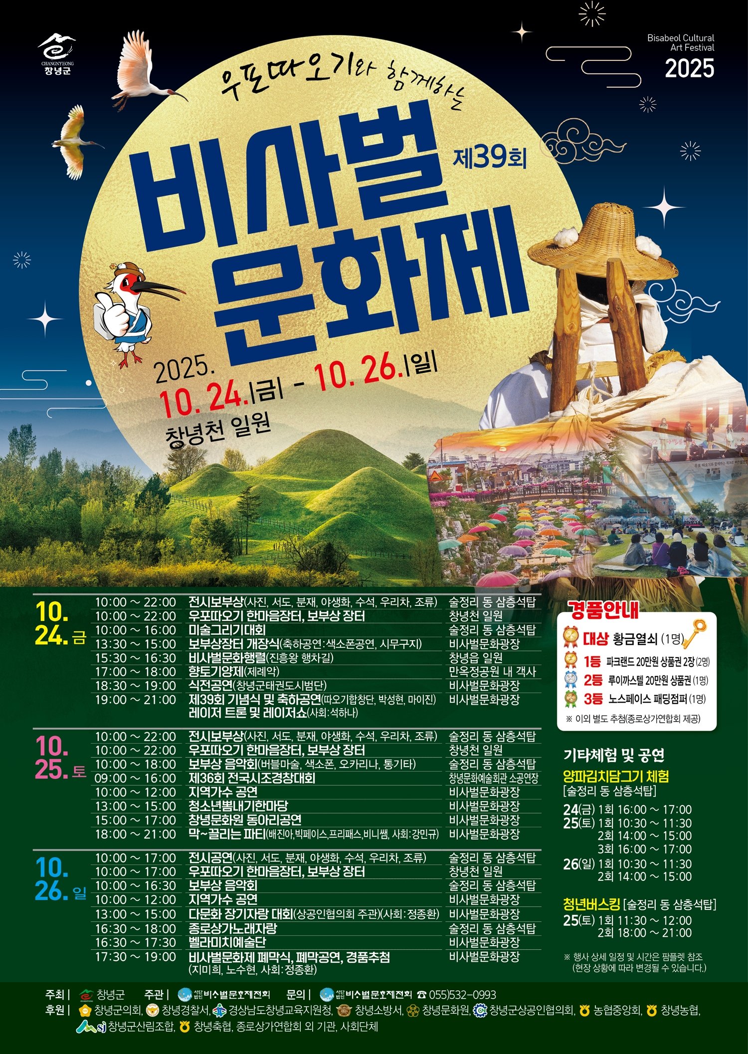 25일과 26일에는 ‘막~끌리는 파티’, 전국시조경창대회, 청소년 뽐내기 한마당, 보부상 음악회, 청년 버스킹, 우포따오기장터 양파김치 담그기 이벤트 등 풍성한 프로그램이 이어진다.