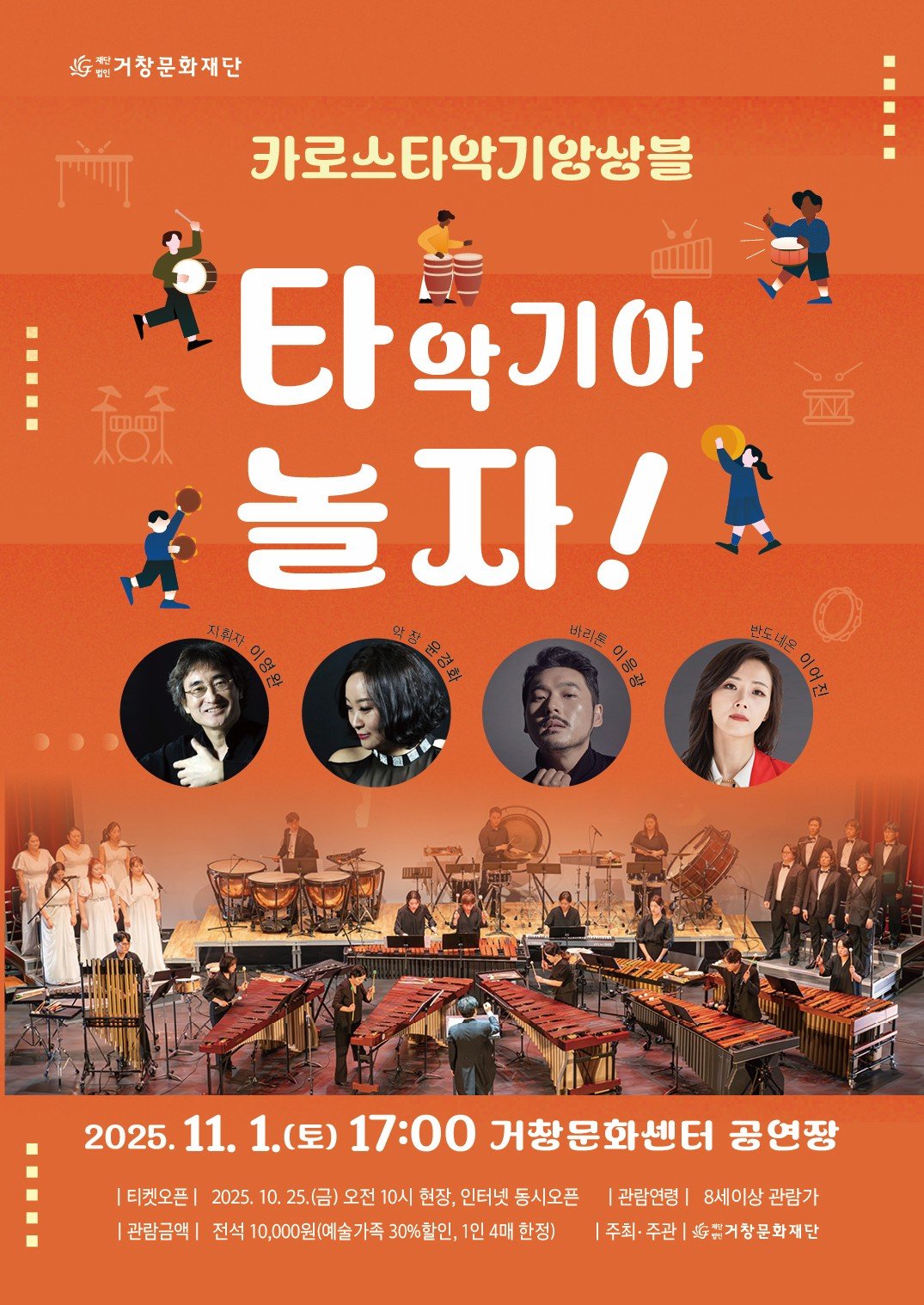 [한국Q뉴스] (재)거창문화재단(이사장 구인모 거창군수)은 오는 11월 1일 토요일 오후 5시 거창문화센터 공연장에서 카로스 타악기 앙상블과 함께하는‘타악기야 놀자!