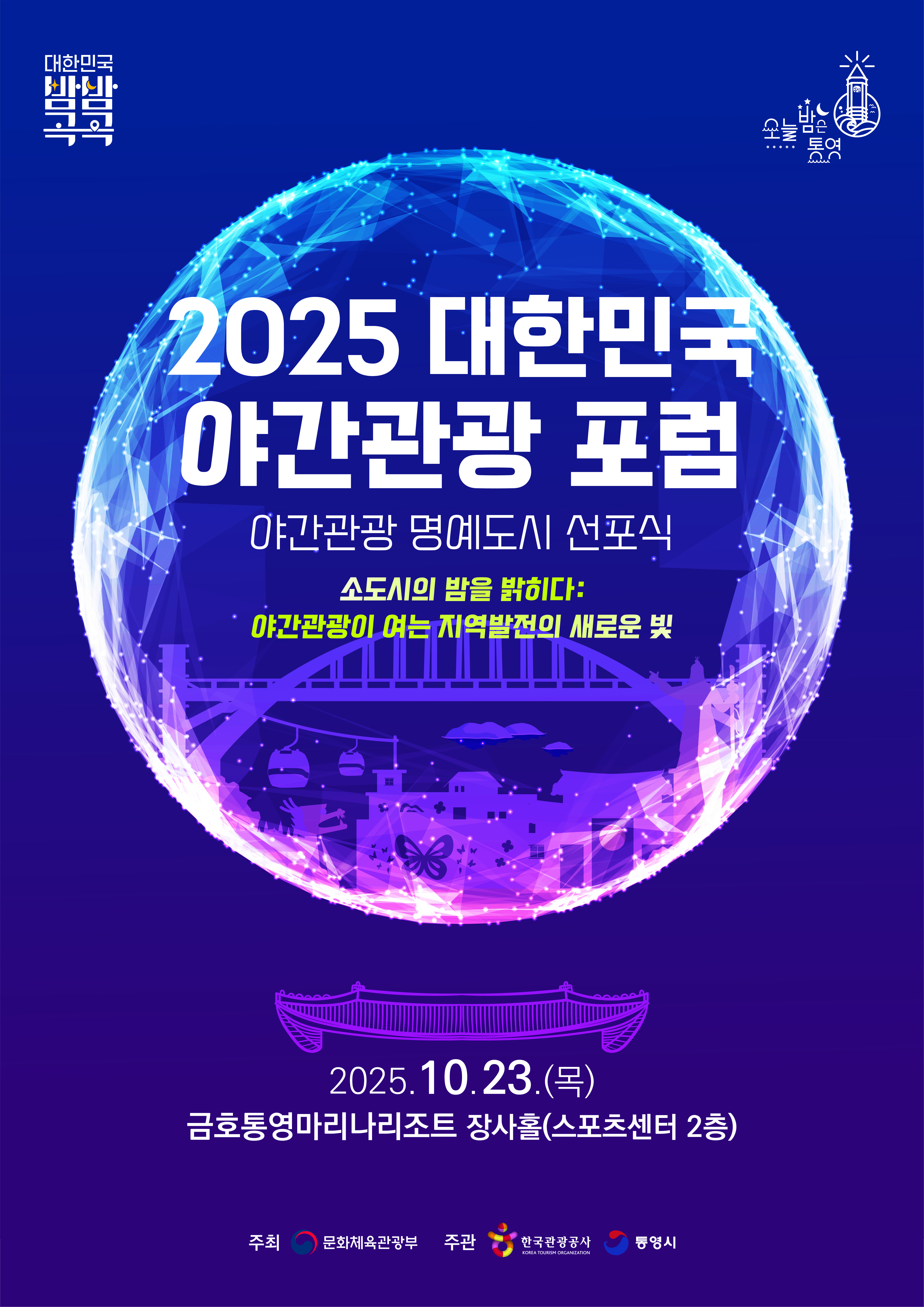 [한국Q뉴스] 통영시(시장 천영기)는 오는 23일(목) 통영 금호마리나리조트에서 문화체육관광부가 주최하고 한국관광공사와 통영시가 공동으로 주관하는 ‘2025 대한민국 야간관광 포럼 및 야간관광 명예도시 선포식’을 개최한다.