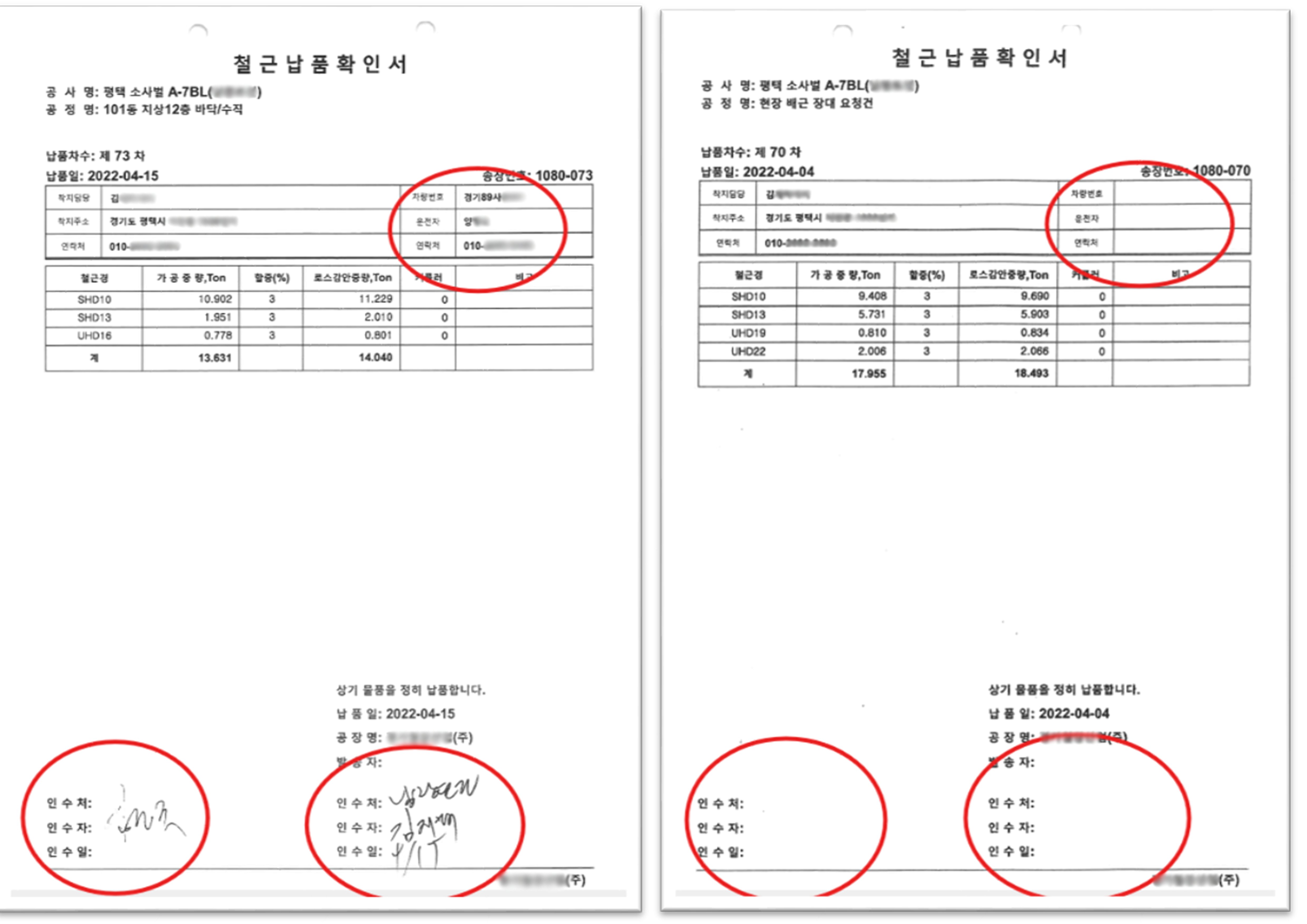 최초 조사에서 철근 설계량과 반입량의 차이가 19.5%로 가장 컸던 평택소사벌 A-7BL의 경우 김은혜 의원실이 직접 철근납품확인서를 확인한 결과 인수처, 인수자, 인수일이 공백으로 비어있음을 확인했다.