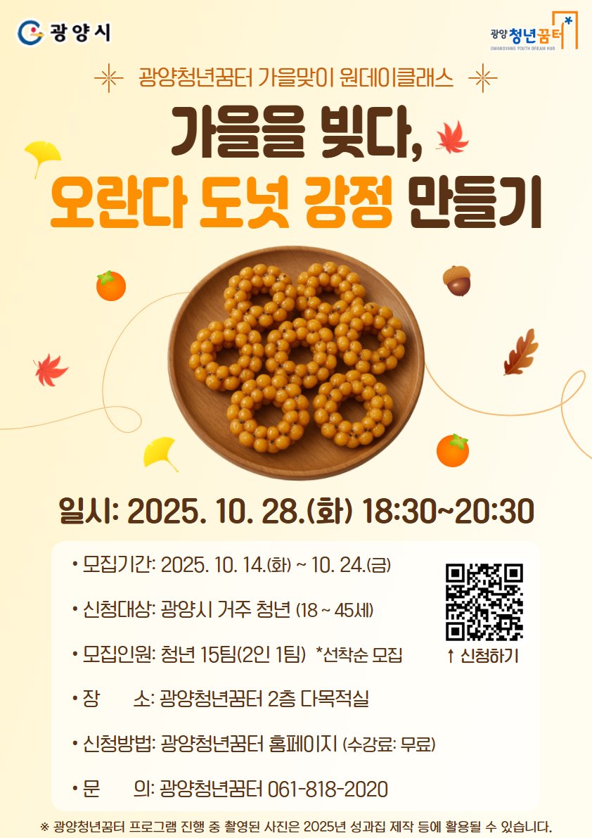 [한국Q뉴스] 광양시(시장 정인화)는 청년들의 여가문화 활성화와 정서적 힐링을 위한 프로그램의 일환으로 광양청년꿈터에서 가을맞이 원데이클래스 ‘가을을 빚다 – 오란다 도넛 강정 만들기’ 참가자를 모집한다고 14일 밝혔다.