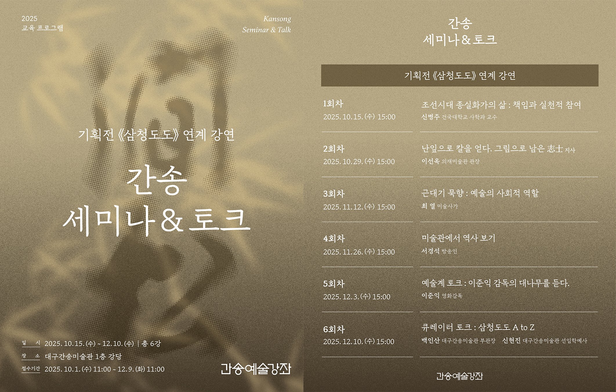 [한국Q뉴스] 대구간송미술관(관장 전인건)은 광복 80주년 기념 기획전 ‘삼청도도 – 매- 죽- 난, 멈추지 않는 이야기’와 연계해 ‘간송예술강좌: 세미나 & 토크’를 운영한다.